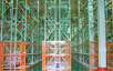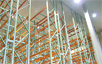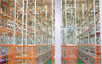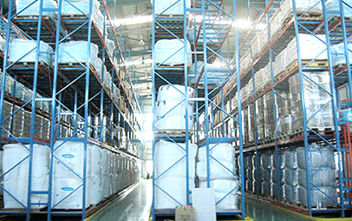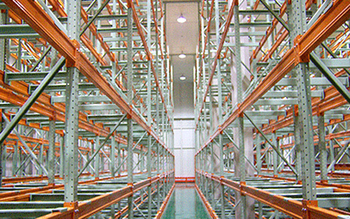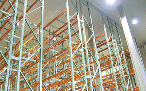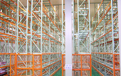 Using exclusive special rack fork lift, it is possible to stack goods to 2-3 times the height of common pallet rack within half the pathway width.