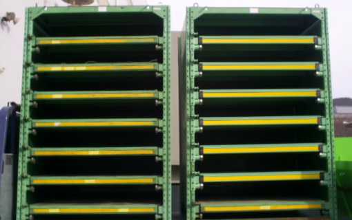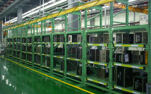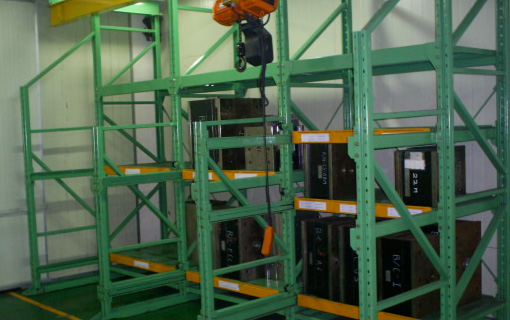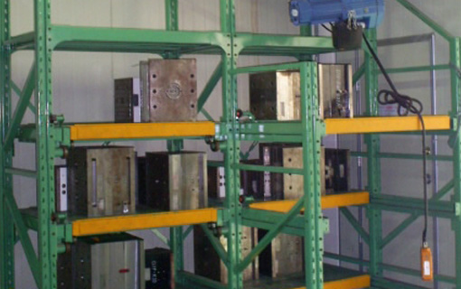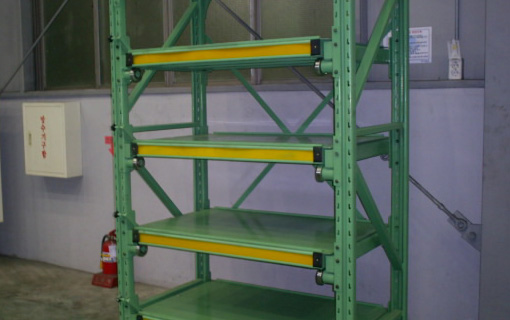 Mold rack is a system to pull out shelf as a whole using special bearing. It is very economical mobile rack system because it doesn't need wide passage and large space to load and store heavy goods.