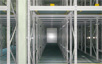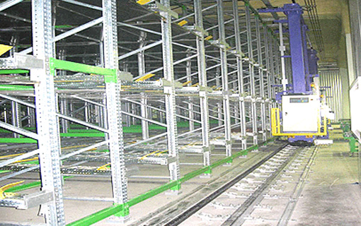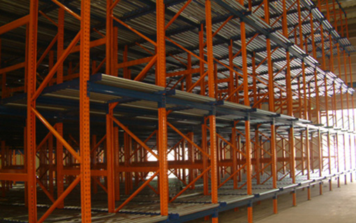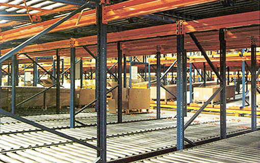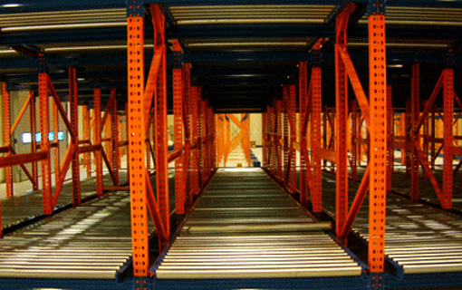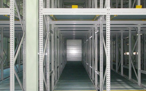 New type of mobile rack uniting rack with inclined conveyer. Warehoused pallets move for exit of its own weight. Only one pathway for each entrance and exit, high efficiency of floor space. High storage efficiency and secure FIFO(first in, first out) of goods.